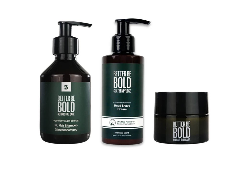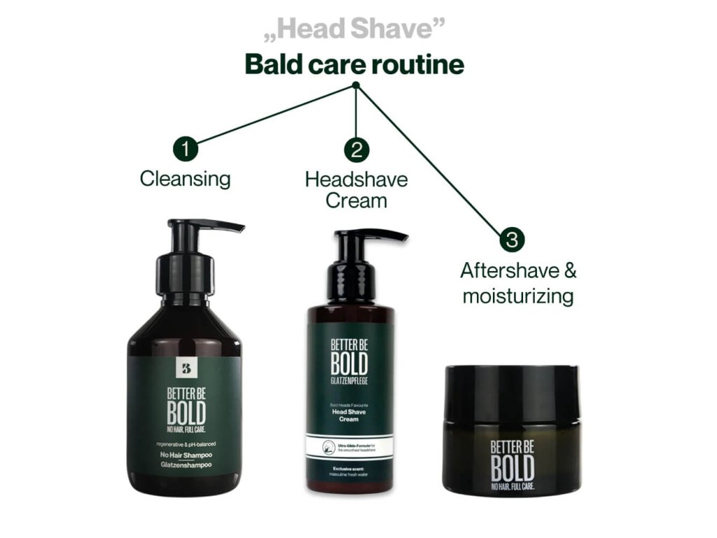 Sada kosmetiky Better Be Bold jednoduše vyřeší pravidelnou péči o holou hlavu. Správná kosmetická rutina funguje v následujících krocích: 1. vyčistit, 2. oholit a 3. hydratovat.