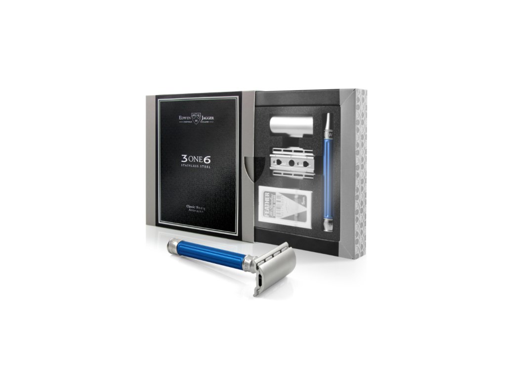 Tento model holicího strojku 3ONE6 má rukojeť z eloxovaného hliníku v modré barvě s podélným rýhováním, zaručujícím pevný úchop. Krček a patka strojku jsou vyrobeny z nerez oceli, stejně jako hlavice, ale díky hliníkové rukojeti je tento model o 26 g lehčí než jeho celo-nerezový bratr.