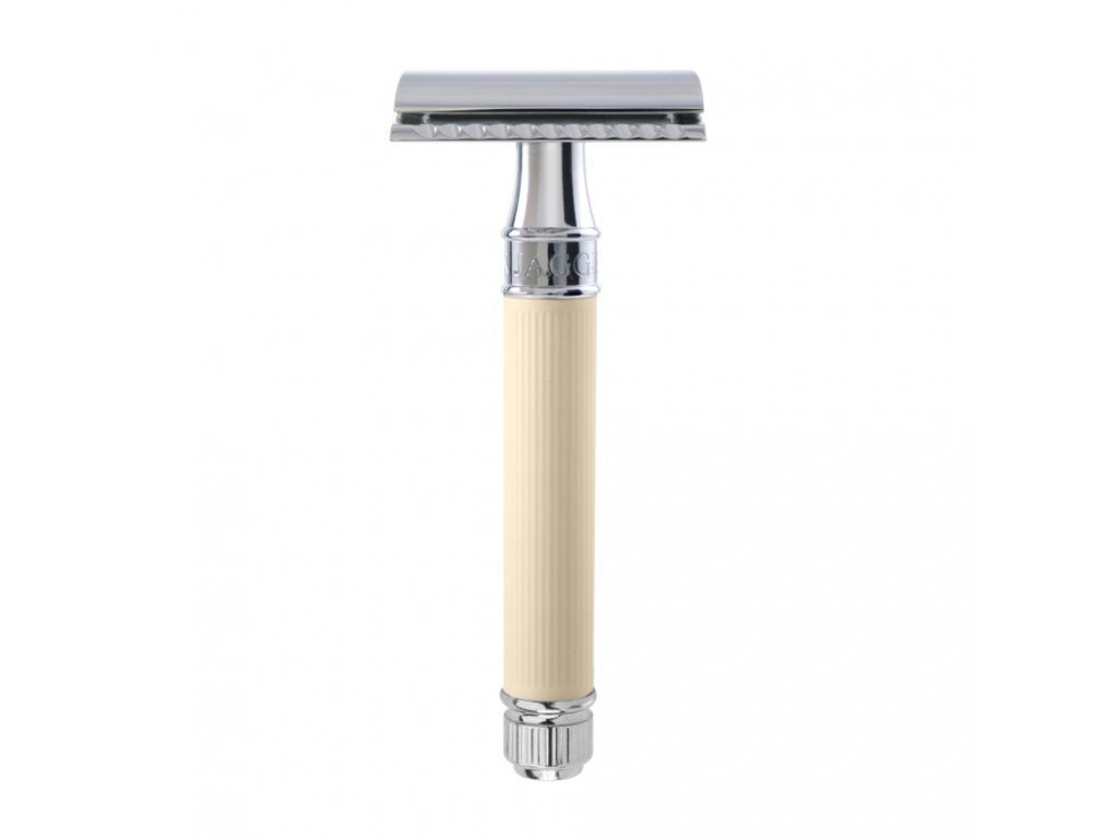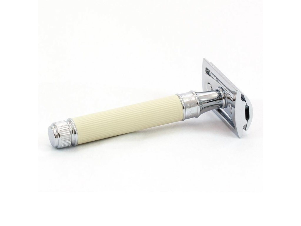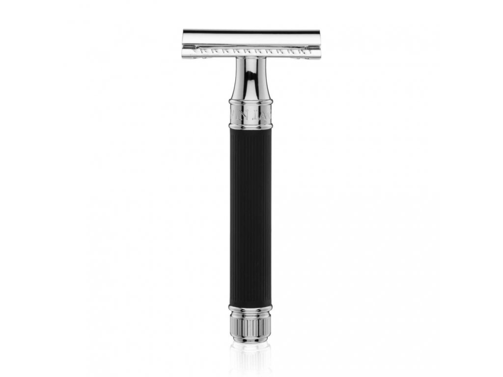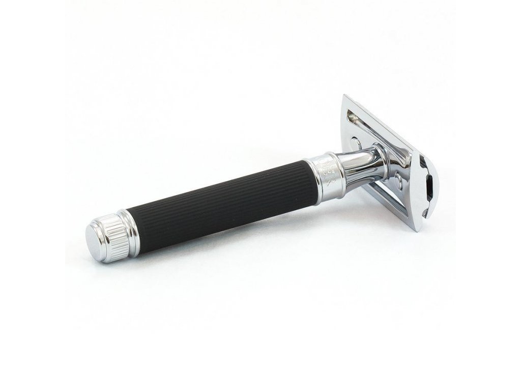 Edwin Jagger Rubber Coated je 3dílný holící strojek s plnou lištou s vynikajícím designem a zpracováním. Hlavice i oba konce rukojeti jsou kvalitně pochromovány, rukojeť je potažená odolnou gumovou vrstvu s podelnými vroubky. Jak už je u Edwin Jagger dobrým zvykem, můžete si vybrat ze 2 barevných variant rukojeti: černé (ebony) a bílé (ivory).