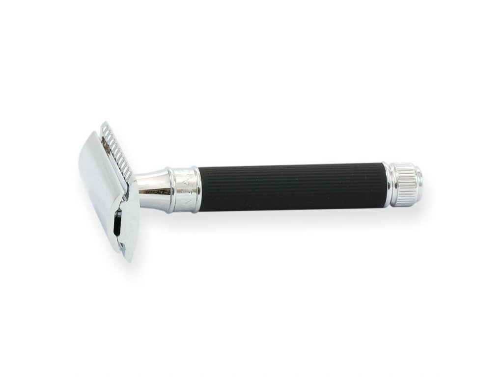 Holicí strojek Edwin Jagger Rubber Coated rozptýlí veškeré obavy z nebezpečí pořezání při vyklouznutí strojku z ruky. Rukojeť je totiž potažená gumou s vroubky, díky které strojek pevně sedí i v namydlené ruce.