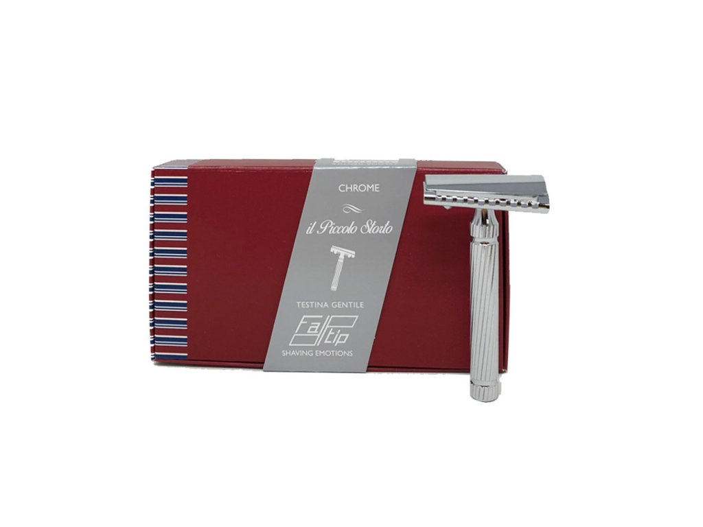 Fatip Piccolo Storto je 3dílný strojek vyrobený z mosazného jádra finálně upraveného stříbrným chromováním. Testina Gentile je hlavice s plnou lištou, která zamezuje přílišnému kontaktu ostří žiletky s pokožkou a díky tomu je holení méně agresivní než u originální hlavice (Testina originale) s otevřenou lištou.