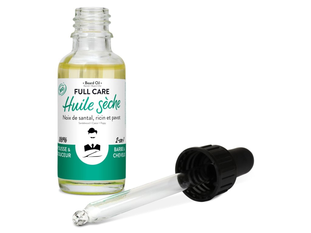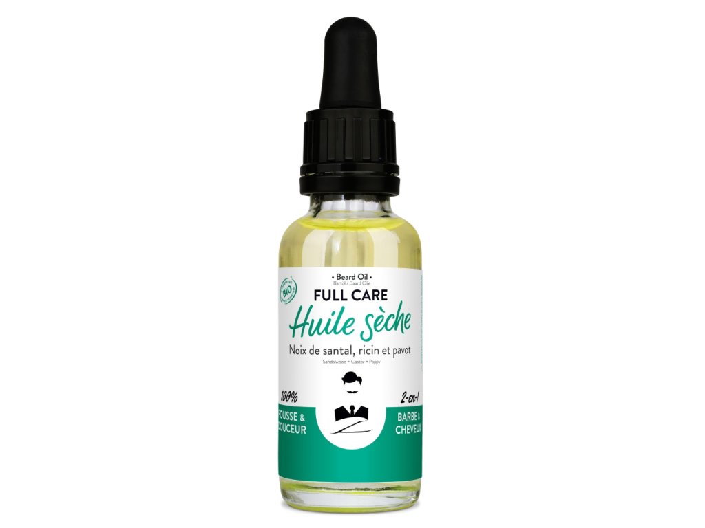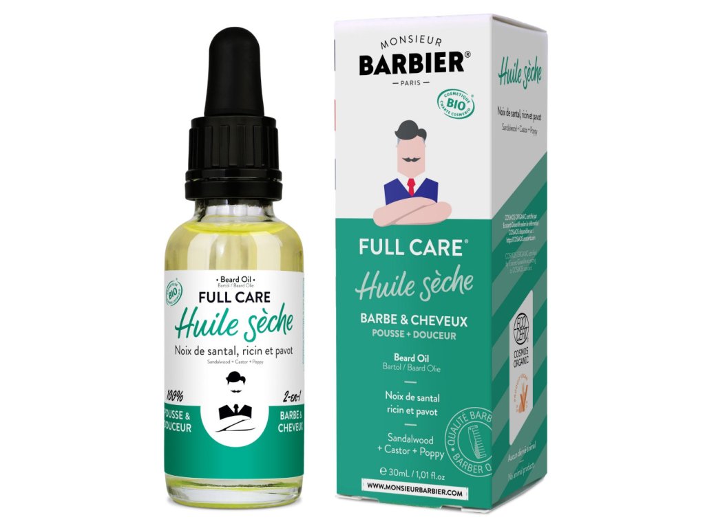 Monsieur Barber Huile Sèche je olej, který můžete použít na vousy, ale i na vlasy. Změkčuje vousy a eliminuje pocit svědění na krku, vlasům dodává zdravý vzhled a lesk. Hydratuje pokožku, velmi rychle se vstřebává a nezanechává vousy ani vlasy mastné. Je vyroben z kvalitní směsi rostlinných olejů (ricinový, makový, rakytníkový) v bio kvalitě. Ricinový olej urychluje růst vousů, makový olej vousy/vlasy změkčuje a obnovuje jejich lesk. Olej má vůni santalového dřeva.