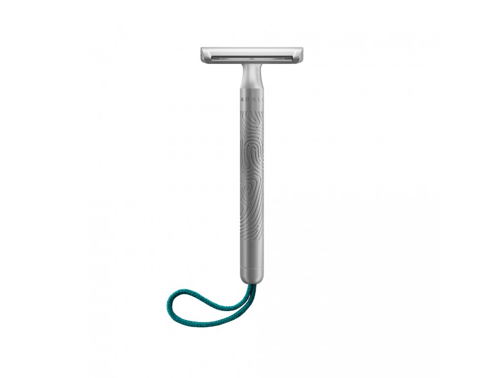 Udržitelnost a zero waste je u tohoto strojku samozřejmostí. Strojek funguje výhradně s klasickými žiletkami, které lze snadno recyklovat. Celokovový strojek skvěle doplňuje šňůrka na zavěšení v tyrkysové barvě, vyrobená z čisté bavlny, kterou můžete jednoduše vyměnit pouhým povytažením patky strojku.