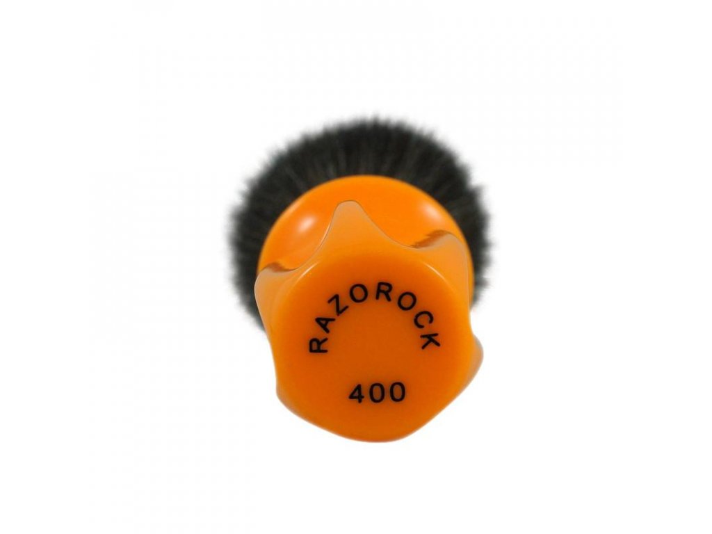 RazoRock 400 Butterscotch je štětka s dlouhou rukojetí vyrobenou ze syntetické pryskyřice karamelové barvy, osazená syntetickými štětinami Noir Plissoft v černé barvě. U syntetických štětin nemusíte čekat až se roztřepí, protože se to nikdy nestane. Jejich špičky jsou měkké od samého počátku a jsou překvapivě pevné v tlaku, takže se příliš neohýbají.