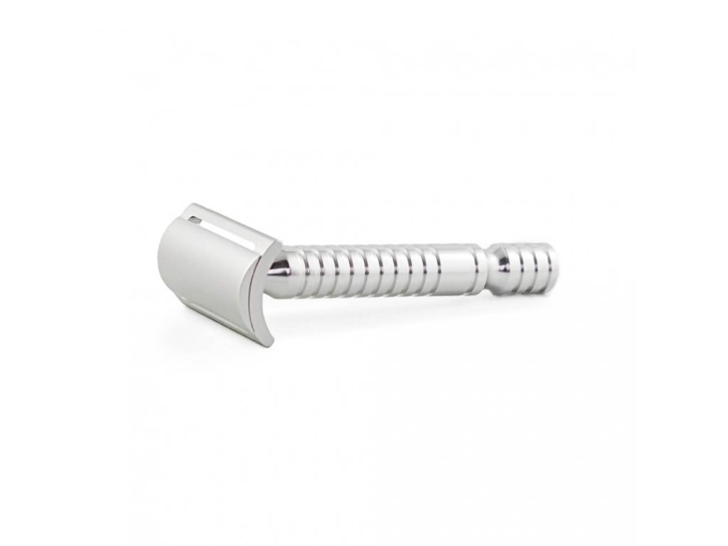 Trojdílný holicí strojek s plnou lištou a minimálním odhalením ostří žiletky je vyfrézován z hliníku. Nízká hmotnost společně s ostrým úhlem náklonu žiletky je zárukou toho, že kontakt ostří s vaší pokožkou bude maximálně ohleduplný. Bezpečný úchop zajistí hluboké vroubkování na rukojeti strojku.