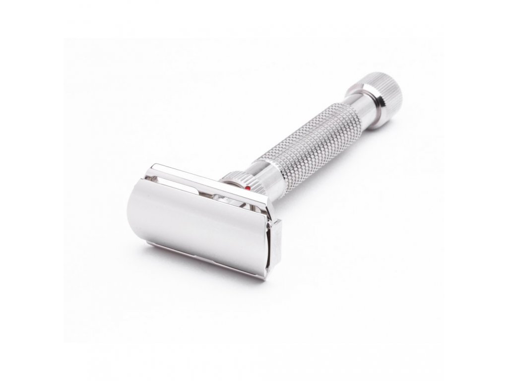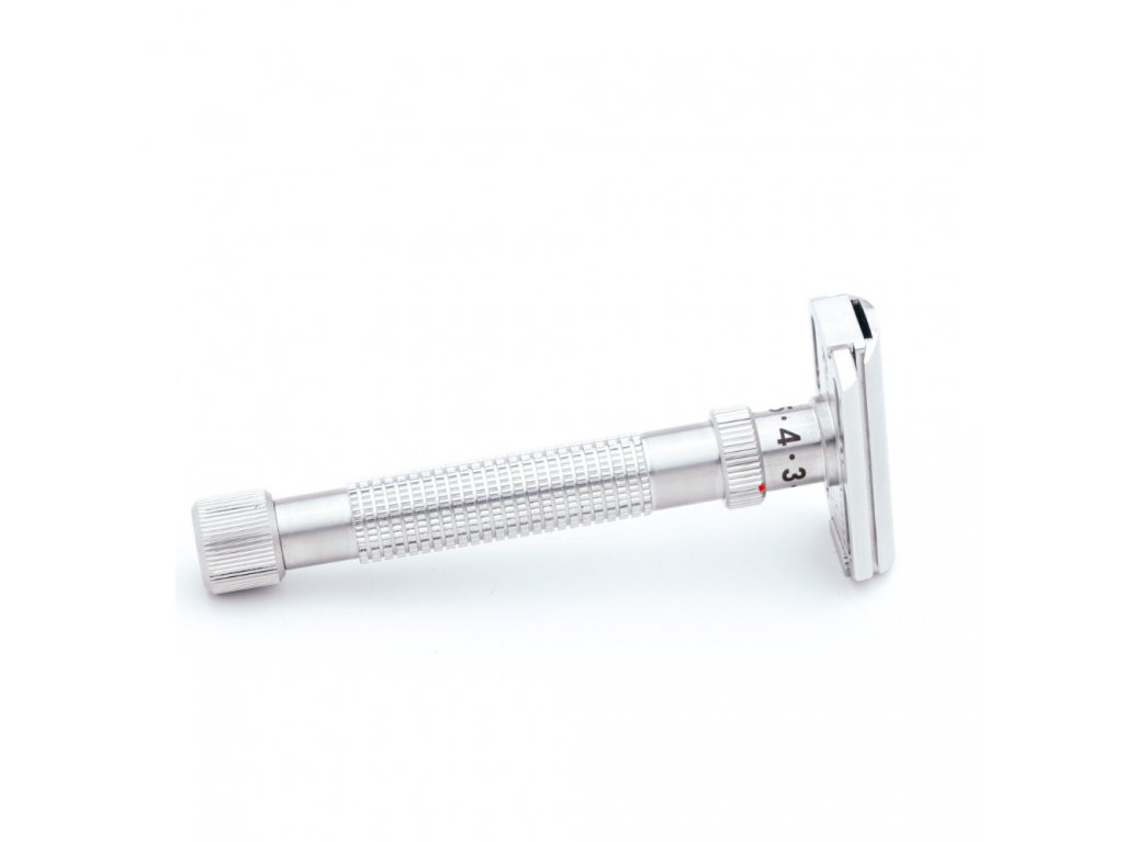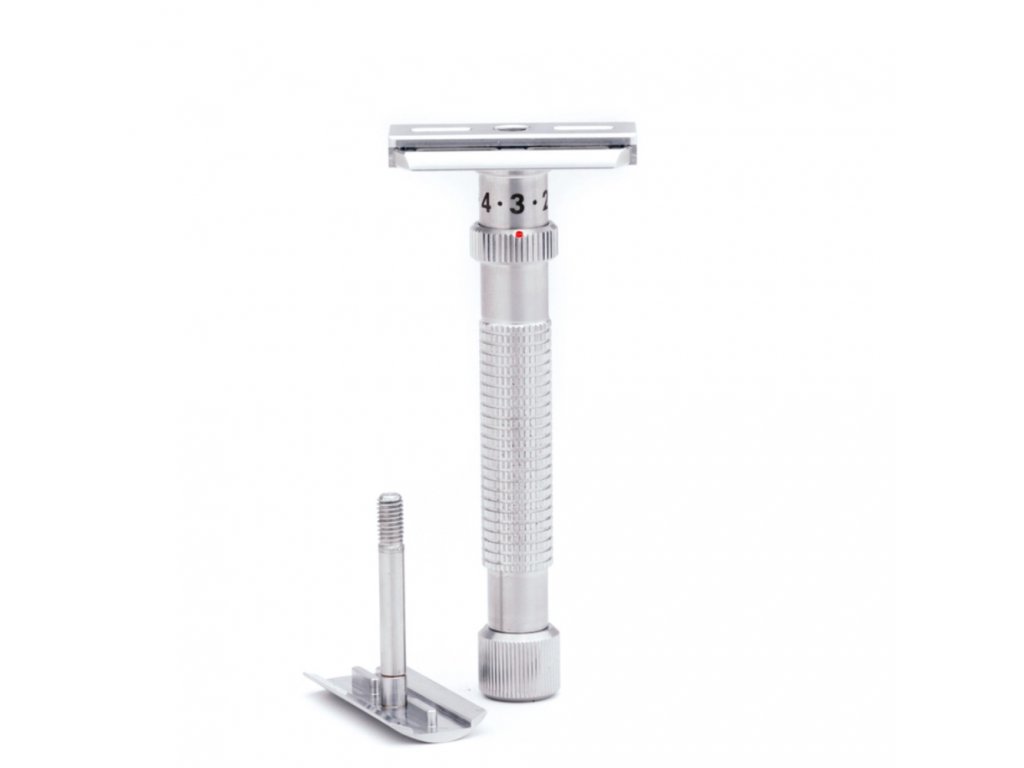 Dvojdílný, výborně vybalancovaný strojek s příjemným a funkčním gravírováním rukojeti nabízí velmi rozsáhlé nastavení mezery mezi žiletkou a spodní deskou hlavice (blade gap). K dispozici je celkem 6 stupňů a stejný počet mezistupňů, díky nimž dokážete strojek nastavit od velmi jemného až po velmi agresivní holení. Hlavice strojku Rex Ambassador je navíc znatelně tenčí než u strojku Merkur Futur, tudíž se s ní snáze holí i obtížněji dostupná místa jako třeba pod nosem. Snadná je i výměna žiletky, otáčením patky strojku povolíte horní desku hlavice, vysunute ji, nasadíte novou žiletku a opačným postupem zkompletujete.