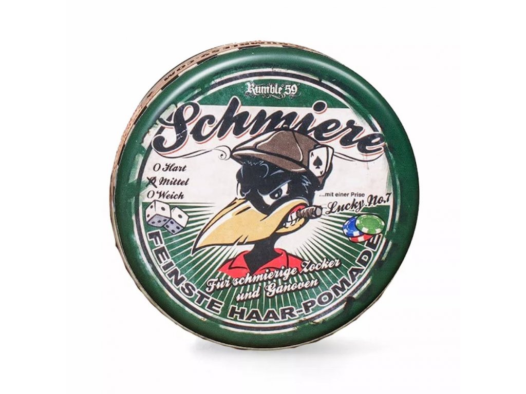 Všechny produkty pocházející od německé značky Rumble59 jsou inspirovány Amerikou z dob ilegálních palíren alkoholu, pouličními gangy s drsnými chlápky, obhroublými dívkami a prvními hvězdami rock'n'rollu. V jejich nabídce najdete kromě oblečení a doplňků i vlastní řadu pomád značky Schmiere. Pomády značky Schmiere s obrázkem havrana uspokojí jak milovníky old school, tak i moderních účesů.